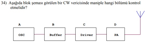 Amatör telsiz sınavı 3 Amatör telsiz sınavı 3 sınava hoş geldiniz. Başarılar dilerim. Sınav sonucunuz burada gözükecektir. 1. Yürürlükteki yönetmeliğe göre, Türkiye’de kaç adet bölge vardır?7810122. Yürürlükteki yönetmeliğe göre, B ve C sınıfı belgeye sahip olanların çağrı işareti hangi ön ek ile başlar?TATBTCYM3. Yürürlükteki yönetmeliğe göre, çağrı işaretlerinde son ekin ilk harfinde hangi harf kullanılmaz?QZEX4. Yürürlükteki yönetmeliğe göre, ikamet adresi değişen amatör telsizciler ile organizasyonlar yeni adreslerini kaç ay içinde Kıyı Emniyeti Genel Müdürlüğüne bildirmek zorundadır?1 ay2 ay3 ay4 ay5. Yürürlükteki yönetmeliğe göre, Afet ve Acil Durum haberleşmesinde görev alan kuruluşlara verilen çağrı işaretinin son ekin ilk harfi aşağıdakilerden hangisidir?KXES6. Yürürlükteki yönetmeliğe göre, Amatör Telsizcilik Belgesinin yenilenmemesi, organizasyonun feshi, tasfiyesi veya yetkilisinin müracaatı üzerine iptal edilmesi, bölge değişikliği gibi durumlarda çağrı işareti kaç yıl süre ile tahsis edilemez?5 yıl10 yıl15 yıl20 yıl7. Yürürlükteki yönetmeliğe göre, özel etkinlikler için çağrı işareti tahsisi kaç gündür?20 gün30 gün40 gün60 gün8. Yürürlükteki yönetmeliğe göre, Amatör Telsizcilik Sınavına girme yaşı kaçtır?7 yaş12 yaş16 yaş18 yaş9. Yürürlükteki yönetmeliğe göre, Lisans düzeyinde hangi bölüm de okuyan adaylar teknik konulardan sınava tabi olmazlar?FizikBiyolojiKimyaİnşaat10. Yürürlükteki yönetmeliğe göre, A ve B sınıfı için oluşturulan 50 sorudan en az kaç puan alanlar A sınıfı Amatör Telsizcilik Belgesi almaya hak kazanır?60 puan70 puan75 puan80 puan11. Amatör Telsiz İstasyonun frekansını, gücünü ve emisyonunu gösteren ulusal yönetmelik hangisidir?Frekans Tahsisinden Muaf Telsiz Cihaz ve Sistemleri hakkında YönetmelikAmatör Telsiz Yönetmeliği2813 sayılı Telsiz KanunuSpektrum Yönetimi Yönetmeliği12. Yürürlükteki yönetmeliğe göre, Amatör Telsizcilik Belgesi kimlere verilmez?Sınavda başarılı olan T.C. vatandaşlarınaMütekabiliyet anlaşması olan ülkelerden Amatör Telsizcilik Belgesi olan T.C. vatandaşlarınaMütekabiliyet anlaşması olan ülkelerden Amatör Telsizcilik Belgesi olan yabancılaraKamu hizmetinden yasaklananlara13. Yürürlükteki yönetmeliğe göre, Amatör Telsizcilik Belgesi almaya hak kazananlardan belge düzenlemesi sırasında aşağıdakilerden hangisi istenmez?FotoğrafT.C. kimlik numarası beyanıSabıka kaydı olmadığına dair beyanOturma belgesi14. Yürürlükteki yönetmeliğe göre, Türkiye’de 3 aydan fazla geçici amatör telsizcilik faaliyetinde bulunacak olan yabancılardan belge düzenlemesi sırasında aşağıdakilerden hangisi istenmez?VekâletnameOturma belgesiPasaport fotokopisiFotoğraf15. Yürürlükteki yönetmeliğe göre, son ekin başına Amatör Telsiz Derneklerine hangi harf verilir?KXES16. 435 MHz’de bir yagi anten, UHF TV antenine doğru çevrilmiştir. Bunun neticesinde Tvde.435 MHz’de alma güçlüğü doğarRF giriş katında aşırı yükleme olur435 MHz de osilasyon başlarTV anteninin elemanları hasar görür17. HF çalışması, yakında bir TV alıcısını enterfere edebilir. Enterferansa neden olan sinyaller aşağıdakilerden hangisi ile TV ye ulaşır?Toprak yoluylaVericinin besleme kaynağı vasıtasıylaVerici frekansının polarizasyonu yoluylaTV anteni kablosunun ekranı ve/veya IF katı yoluyla18. CQ çağrısı yapılırken aşağıdakilerden hangisi uygulanır?Zayıf bir istasyonun çalıştığı bir frekansta çağrı yapmakDaima CW kullanmakSadece uzak istasyonlara çağrı yapmakÇağrıya başlamadan önce frekansın boş olup olmadığını kontrol etmek19. Aşağıdakilerden hangisi rahat ve net okunabilen bir sinyal seviyesini ifade eder?R1R5S9T920. Enterferans riskini azaltmak için, bir UHF TV anteni, kısa dalga verici anteninden ne kadar uzağa yerleştirilmelidir?Mümkün olduğunca uzağaMümkün olduğunca yakına1.098 m uzağa432 MHz’in yarım dalga boyu uzağına21. Amatör bandda dinleme halinde iken karşıdan TA5A gibi bir çağrı işareti duyulduğunda, bu çağrı işareti aşağıdaki illerin hangisinden yapılmış olabilir?AnkaraAdanaMardinTrabzon22. Amatör banda dinleme halinde iken karşıdan TA7CA gibi bir çağrı işareti duyulduğunda bu çağrı işareti aşağıdaki illerin hangisinden yapılmış olabilir?ŞırnakErzincanBingölMardin23. Greenwich’te 20 Ekim saat 23:00 iken 40 derece doğu boylamında tarih ve saat kaçtır?20 Ekim saat 11:0020 Ekim saat 00:4021 Ekim saat 01:4021 Ekim saat 11:1024. 30 derece doğu boylamında bulunan bir ülkede saat 22:00 iken 30 derece batı boylamında bulunan bir başka ülkede saat kaç olur?Aynı gün 14:00Aynı gün 18:00Ertesi gün 06:00Ertesi gün 14:0025. Aşağıdaki frekanslardan hangisinde SSB haberleşmesi yapılabilir?14010 KHz7010 KHz14250 KHz21035 KHz26. Frekansı değiştirdiğinizi belirtmek için kullanılan “Q” sinyali hangisidir?QRUQSYQSLQRZ27. Eğer başka bir istasyonla konuşuyorken bir acil durum çağrısı duymuşsanız ne yapmalısınız?Frekansın kullanımda olduğunu çağrı istasyonuna söyleyinizÇağrı istasyonunu en yakın acil durum ağ frekansına yönlendirinizÇağrıyı görmezden geliniz ve konuşmanıza devam edinizDerhal konuşmayı bırakınız ve acil duruma cevap veriniz28. Aşağıdakilerden hangisi sadece uzak mesafe istasyonlarına genel bir çağrıdır?CQ CQ CQ de TA2KA TA2KA TA2KA kTA2R de TA2KA TA2KA knCQ DL CQ DL CQ DL de TA2KA TA2KA TA2KA kCQ DX CQ DX CQ DX de TA2KA TA2KA TA2KA29. “CQ contest CQ contest this is TA2KA “ gibi bir çağrı hangi anlama gelir?TA2KA genel çağrı yapıyorTA2KA test yapıyorTA2KA yarışma istasyonlarına genel çağrı yapıyorTA2KA deprem duyurusu yapıyor30. TB3CTR ‘ nin milli fonetik alfabeye göre hecelemesi ne şekilde ya